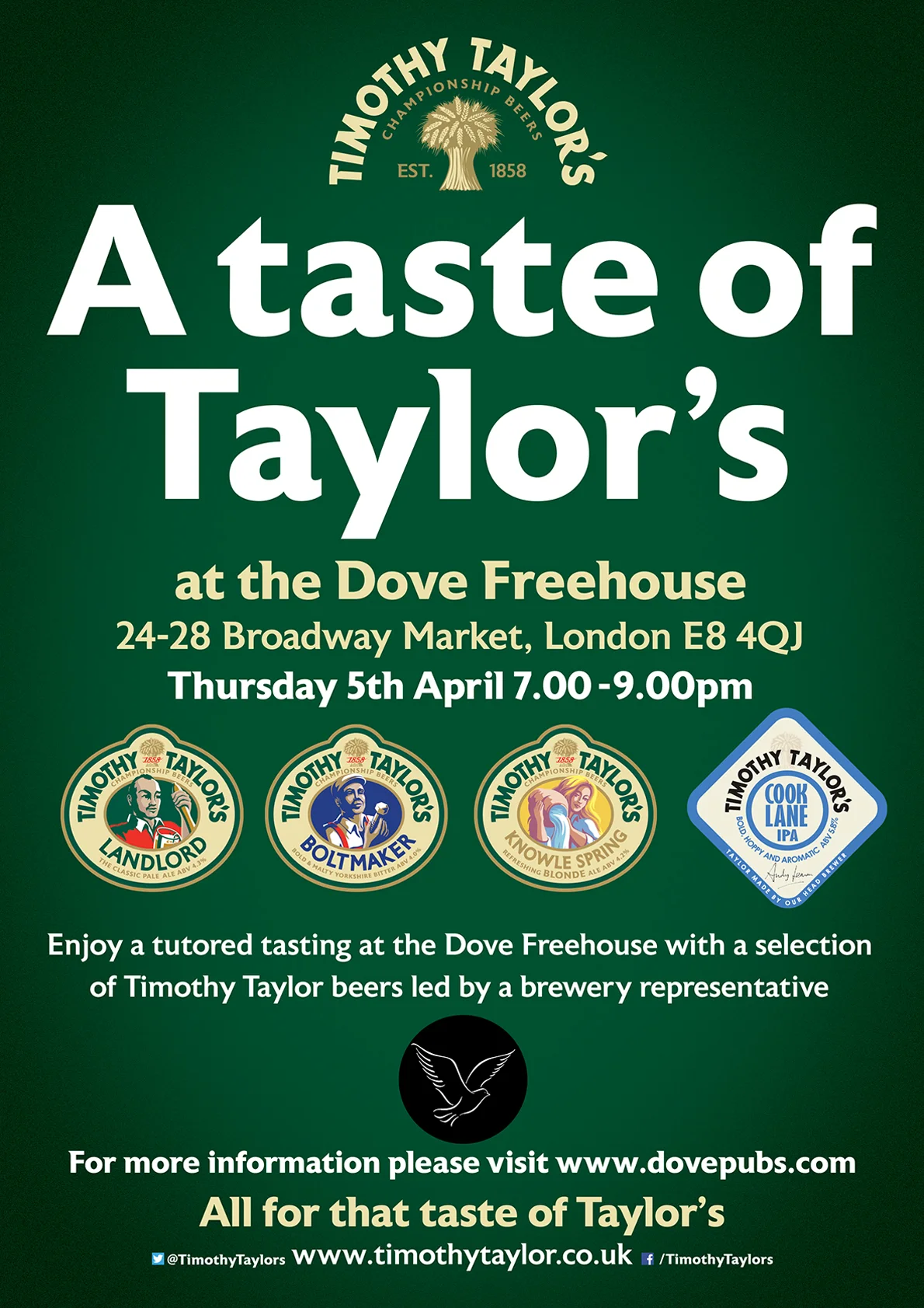 Enjoy a tutored tasting at The Dove Freehouse with a selection of Timothy Taylor beers led by a brewery representative.